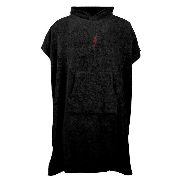 Poncho de la mítica marca de surf Lightning Bolt fabricado en tejido de toalla rizo con el logo del rayo bordado en color rojo.